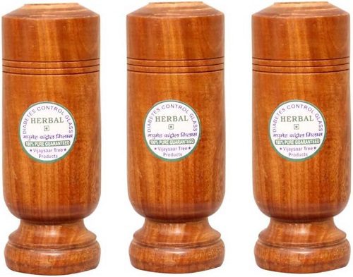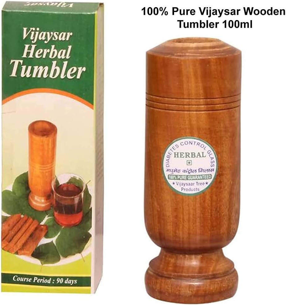 Vijaysar Wood Tumbler. Pour drinking water in a glass wooden tumbler at night. After 8-10 hours the water will turn brown in color. Consume this colored water 30 minutes before breakfast. Once again pour drinking water in a tumbler and consume it 30 minutes before dinner. Please Note: This particular herbal wood has a tendency to develop cracks/leakages during use sometimes. Such instances do not reduce the medicinal value of this product. In such cases, simply place the wooden tumbler in any vessel/container and keep using it. We have not used any abrasive/polishing material inside or outside the tumbler. It is a 100% natural product. You may scratch the insides of the glass with a sharp object to maintain the brown color life for a few days. Tumbler life: Up to 60 days. Once the tumbler water stops becoming brown, then you need to change the tumbler.